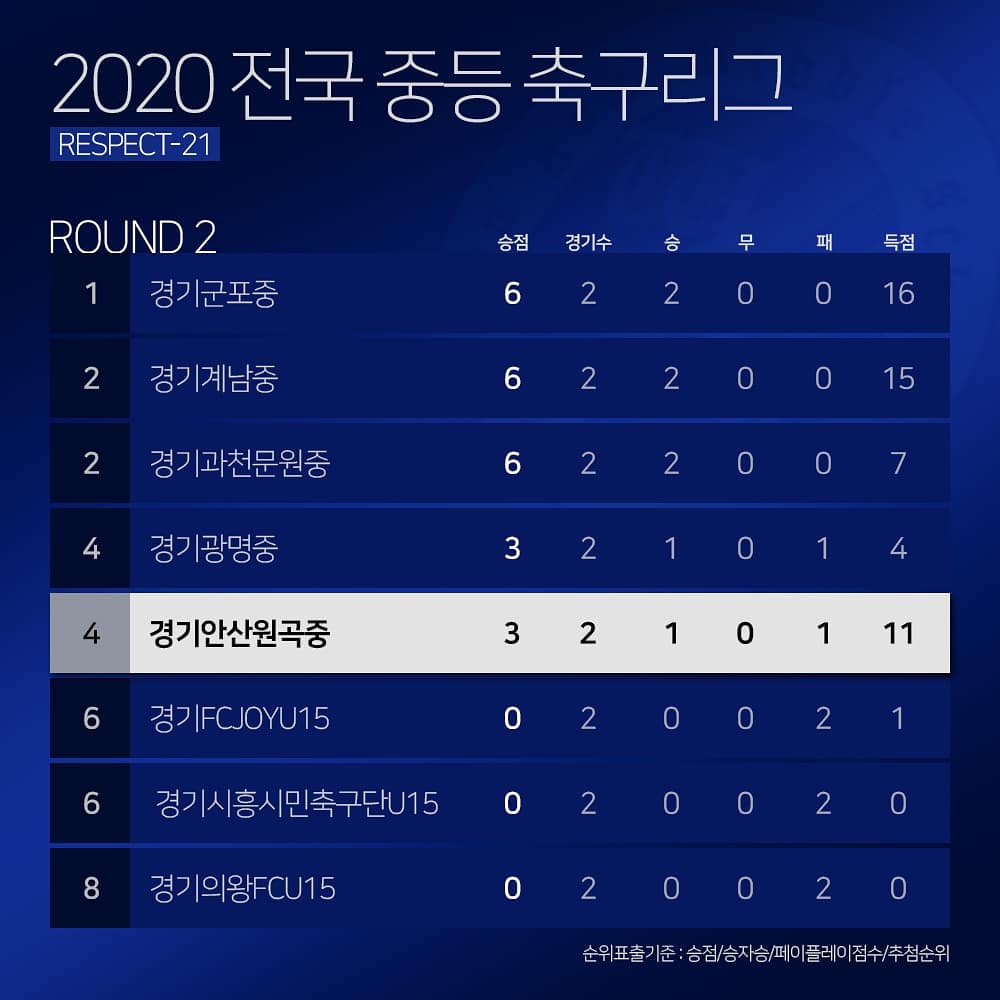 2020 전국중등 축구리그 경기도 축구리그 M-RESPECT 21 경기도 용인축구센터에서 진행되는 중등리그 코로나19로 무관중 경기 경기안산 원곡중 축구 일정 안산원곡중 vs 경기의왕FC U15 안산원곡중 vs 경기계남중 안산원곡중 vs 경기 FC JOY U15 안산원곡중 vs 시흥시민구단 U15 안산원곡중 vs 경기군포중 안산원곡중 vs 경기광명중 원곡중 화이팅입니다. Sports 2020.10.19